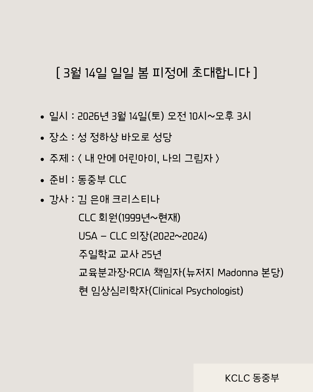 | 18 | [공지] 3월14일 동중부 CLC [ 일일 봄 피정 안내 ] | 2026-2-3 | 867 |