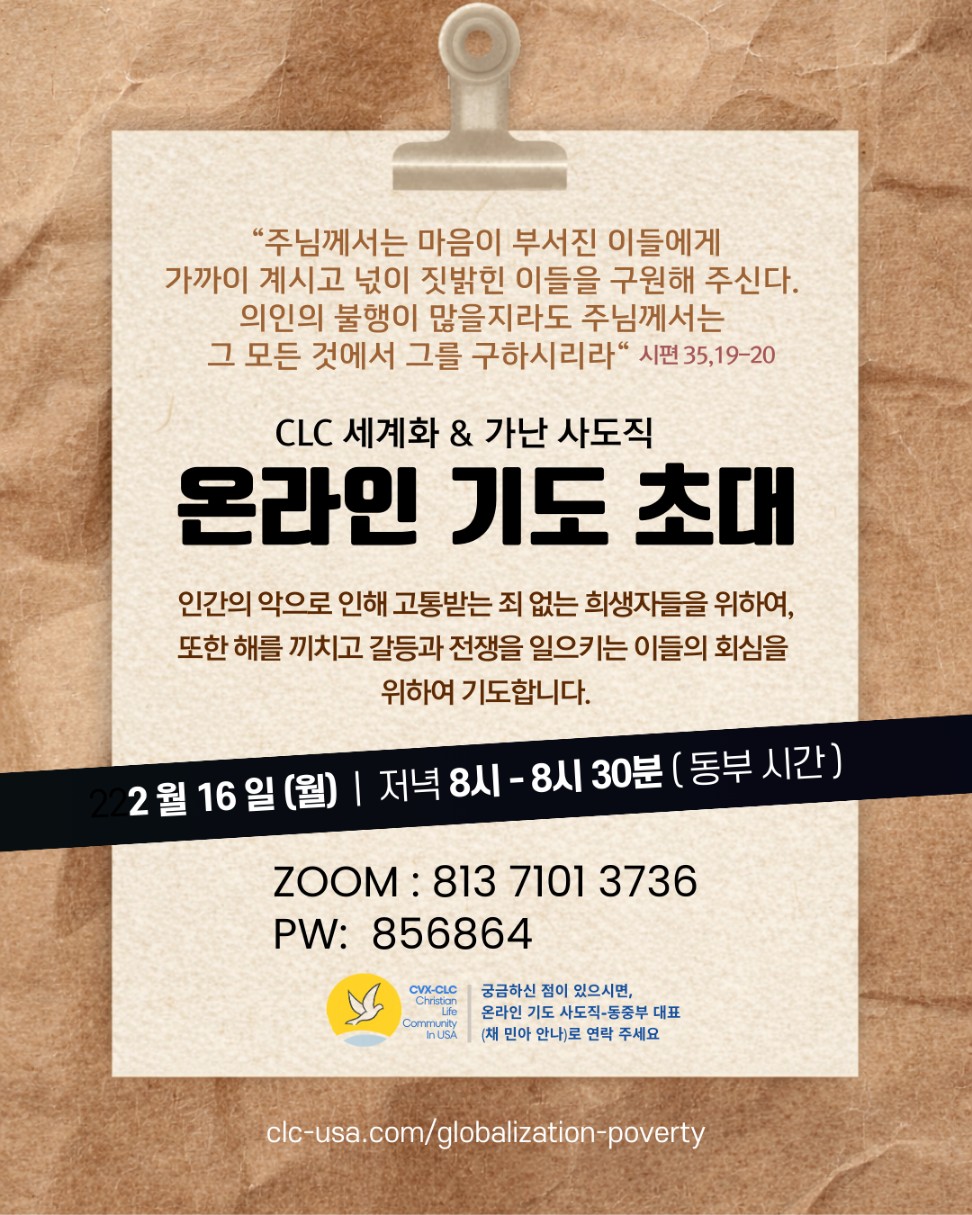 2월 16일(화) <상처 입은 세상을 향한 우리의 응답-‘가난과 세계화’ 온라인 기도 모임>에