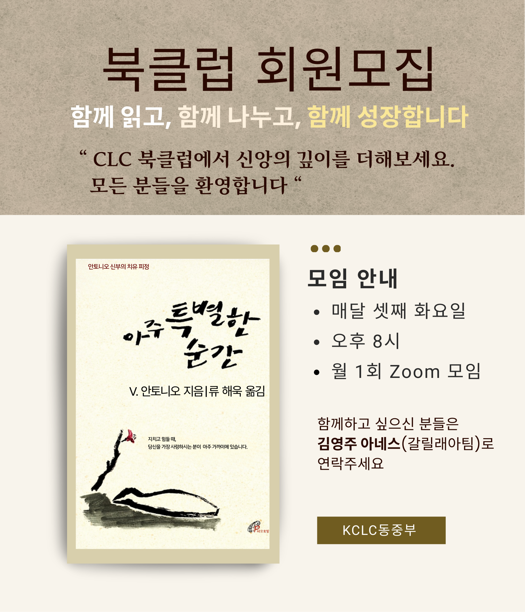 매월 셋째 화요일, 오호 8시/ 월 1회 ZOOM 모임입니다.